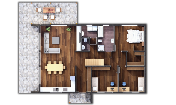 Wnętrze zaprojektowano funkcjonalnie i estetycznie. Centralnym punktem jest przestronny salon z jadalnią oraz otwartą kuchnią, tworząc idealną przestrzeń do wspólnego spędzania czasu. Duże okna zapewniają naturalne oświetlenie i prowadzą na taras, który świetnie sprawdzi się jako miejsce na relaks na świeżym powietrzu.
